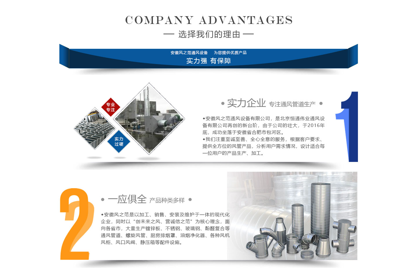 安徽風之范通風設(shè)備有限公司,是北京恒通偉業(yè)通風設(shè)備有限公司再創(chuàng)的新臺階,多年來,公司員工憑著“誠信敬業(yè)、團結(jié)拼搏、勇于開拓、務實進取”的企業(yè)精神,先后承接了多項重點工程項目,使公司健康穩(wěn)步發(fā)展。現(xiàn)由于公司的壯大,業(yè)務的拓展,又于2016年底,成功坐落于安徽省合肥市包河區(qū)。本公司生產(chǎn)設(shè)備精良,技術(shù)力量雄厚,質(zhì)保體系完善!讓用戶體驗到,貼心的服務,無憂的售后!風之范是以加工、銷售、安裝及維護于一體的現(xiàn)代化企業(yè),同時以“創(chuàng)未來之風、營誠信之范”為核心理念,面向全國各省市,大量生產(chǎn)鍍鋅板、不銹鋼、玻璃鋼、酚醛復合等通風管道、螺旋風管、廚房排煙罩、油煙凈化器、各種風機風柜、風口風閥、靜壓箱等配件設(shè)施。廣泛承接商場、工廠、酒店、寫字樓、地下室等,消防排煙工程、除塵凈化工程、室內(nèi)通風工程、暖通空調(diào)工程、廚房排煙凈化工程。我們力求上進,追求,歡迎各界人士技術(shù)指導,經(jīng)濟合作,共創(chuàng)美好明天!